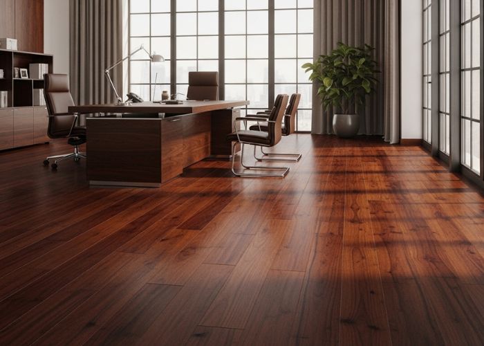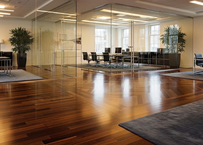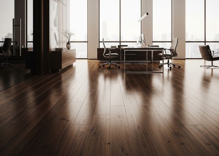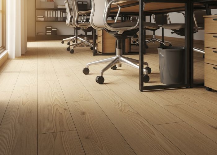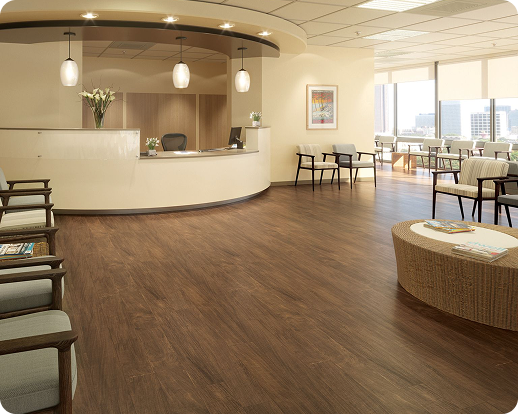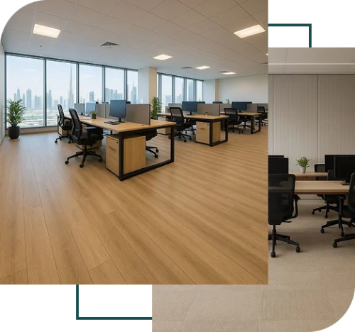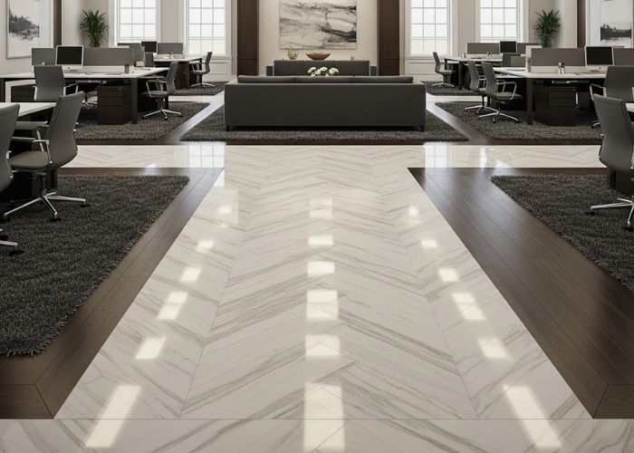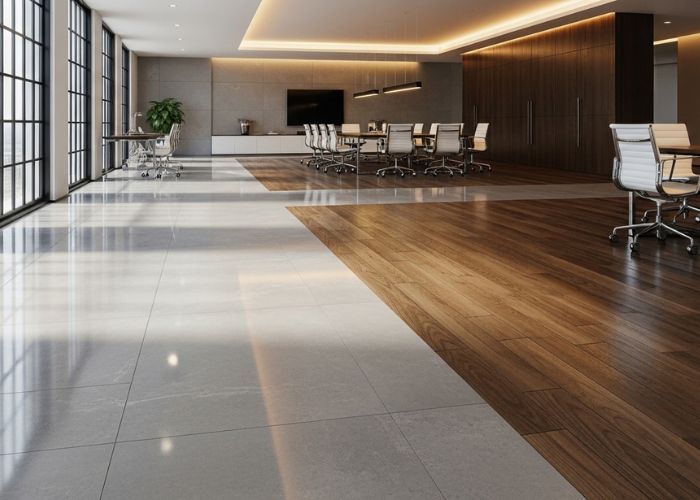 Office vinyl flooring with a commercial-grade wear layer is typically the most feasible option in a reception area and in large corridors. It is waterproof and is not prone to scuffing. We tend to suggest various materials for various areas instead of the same materials on the entire floor plate.